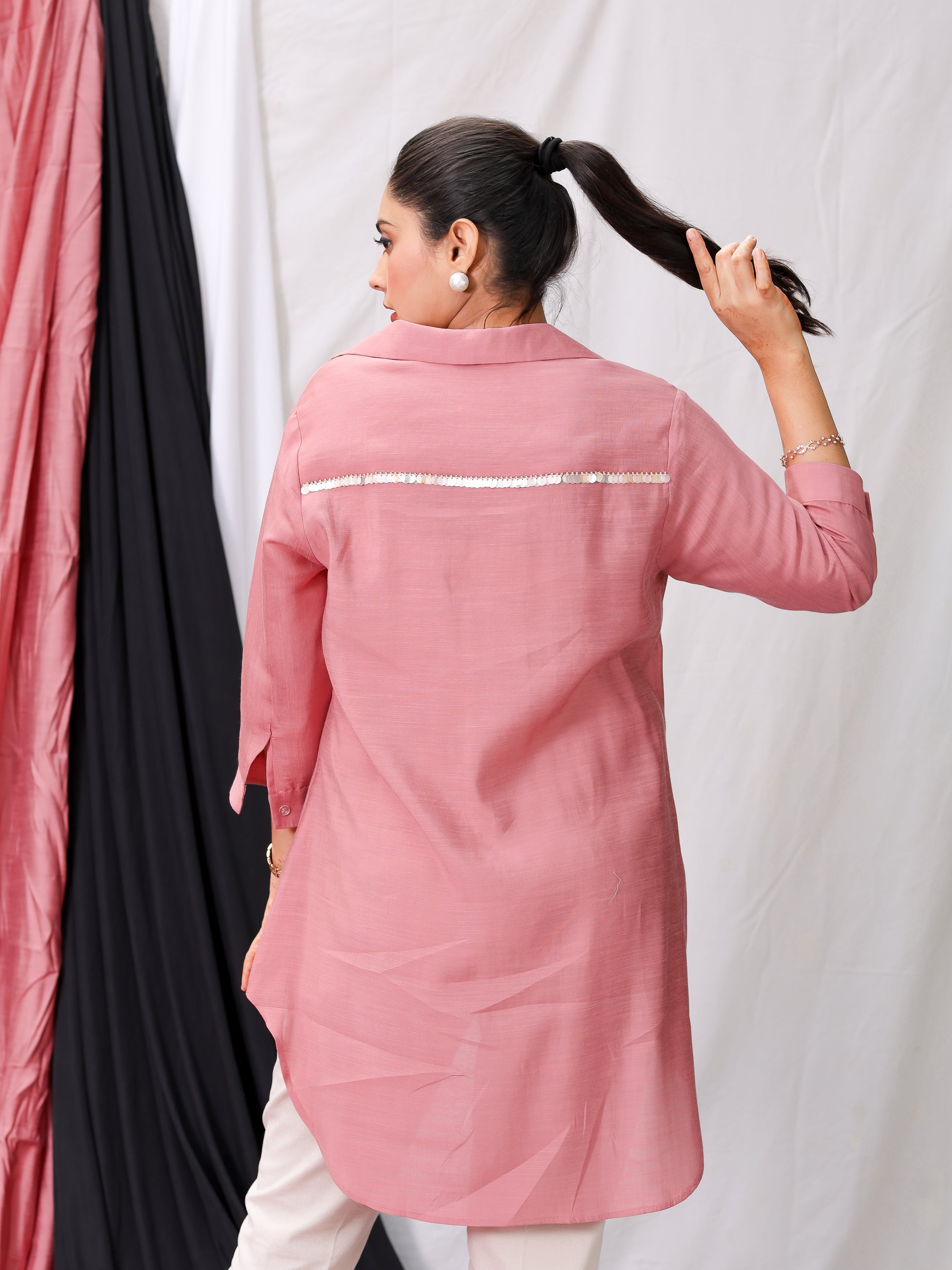 The Avani Silk Peach Pink Embellished Shirt is elegance that moves with you. Crafted from luxurious silk, it drapes softly over your body, with a soft, elongated back that follows your natural curves, enhancing your shape effortlessly. The peach-pink hue radiates warmth, while delicate embellishments add a touch of glamour.